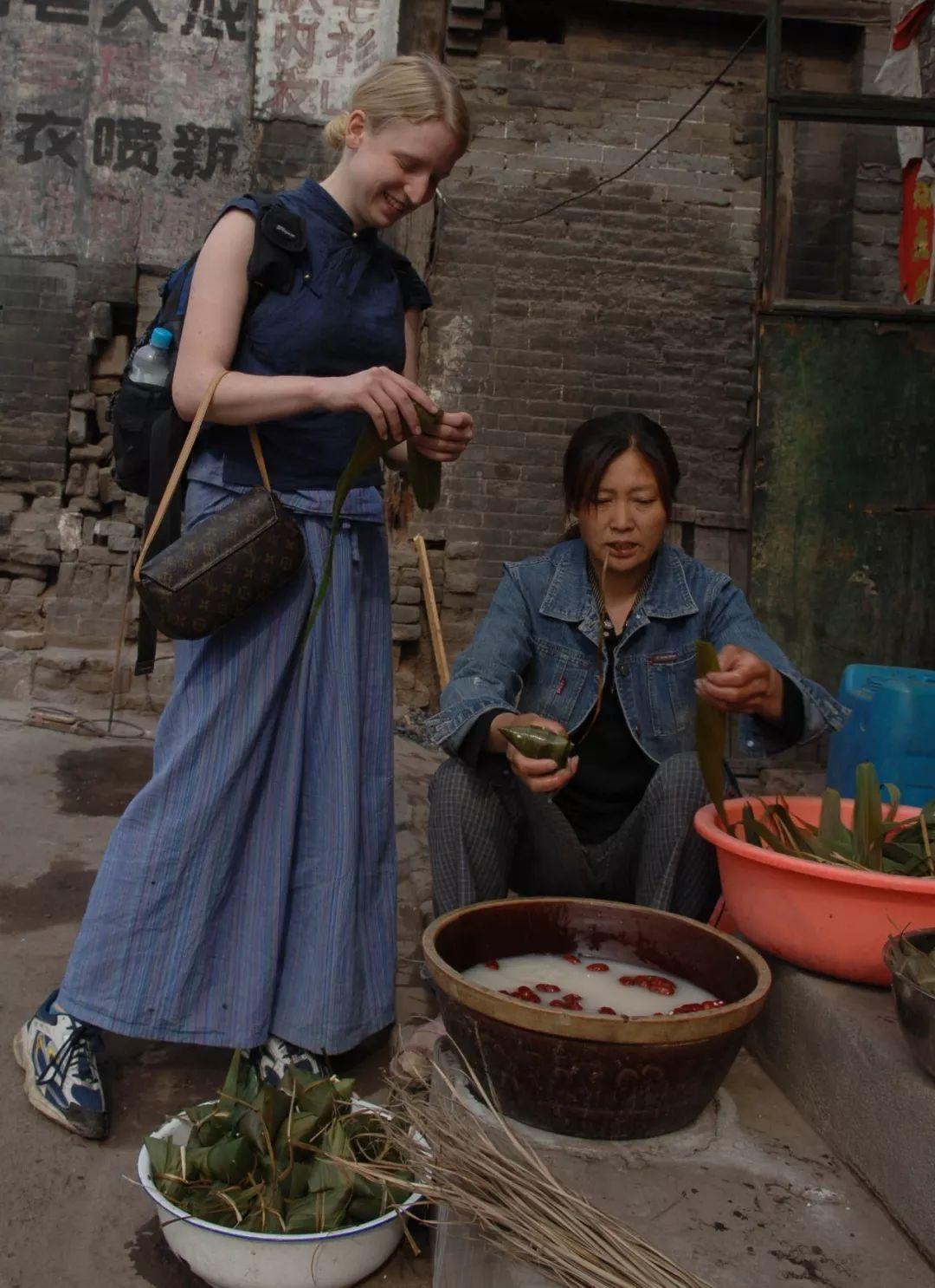 一名外国游客在山西省平遥县街头学习包粽子(2006年5月31日)。