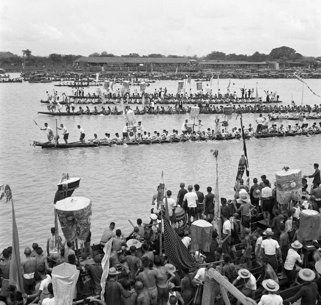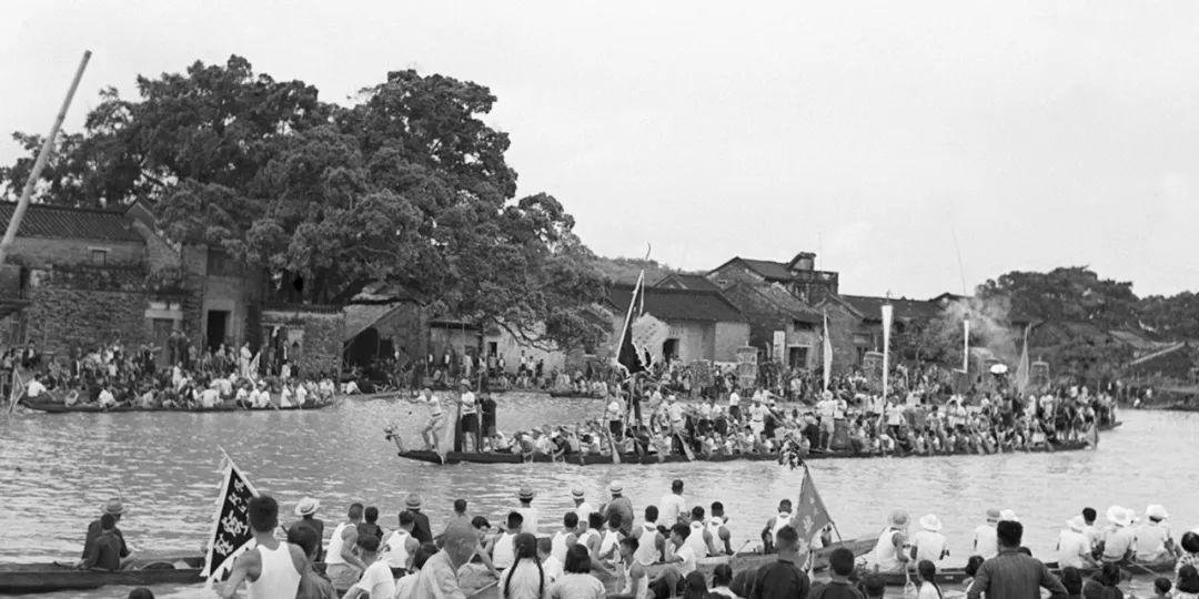 1955年6月24日,广州市十八只龙舟在荔枝湾表演。许颖摄(新华社发)