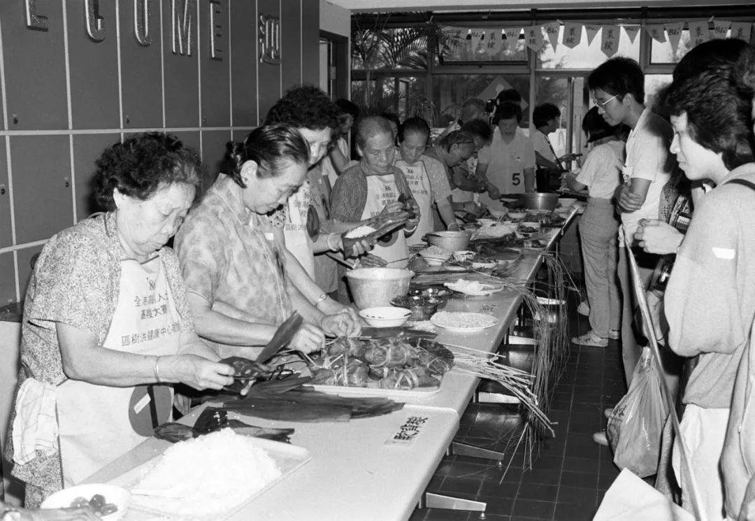 香港近百名60岁至90岁的老人参加包粽子比赛。他们自带糯米和配料,在限定的时间内多包快包,还要包一对色香味俱全、外形精巧的粽子(1986年)。新华社记者 丁补天 摄