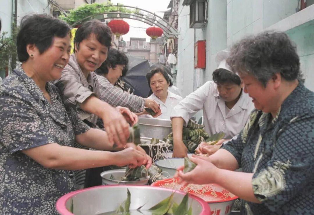 上海南京东路街道仁济居委会举办民族民俗文化节,使弄堂里巷处处充满了节日气氛。图为居民们正在学包各式各样的粽子(1999年6月18日)。新华社记者 陈飞 摄