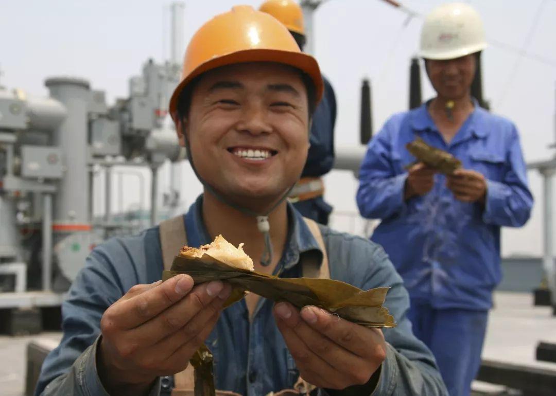 农民工李红文在邯郸市永年召庄110千伏变电站工地品尝供电公司送来的粽子(2010年6月12日)。新华社发(王九忠 摄)