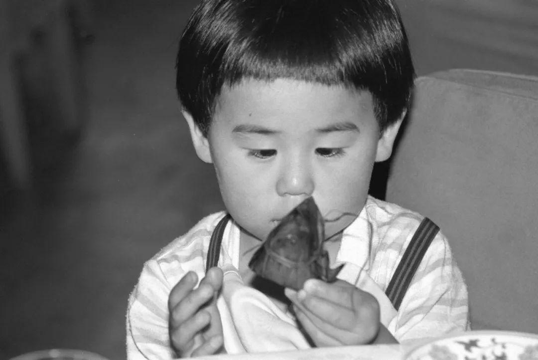 1987年5月31日,北京饭店为庆祝端午节给客人准备了粽子宴。两岁的日本小朋友远藤哲弥第一次见到粽子、不知从何下手。新华社记者 唐师曾 摄