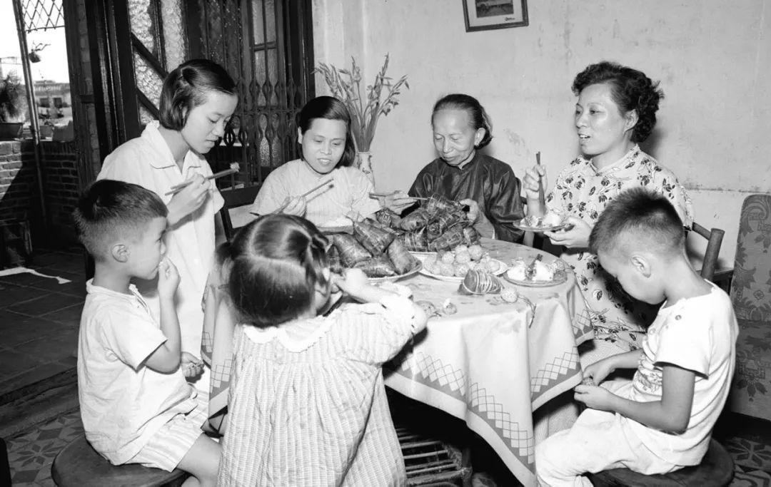 侨眷欢度端午节。居住在广州市的美洲华侨眷属邝美英一家人在吃粽子(1955年7月4日)。薛子江摄(新华社稿)