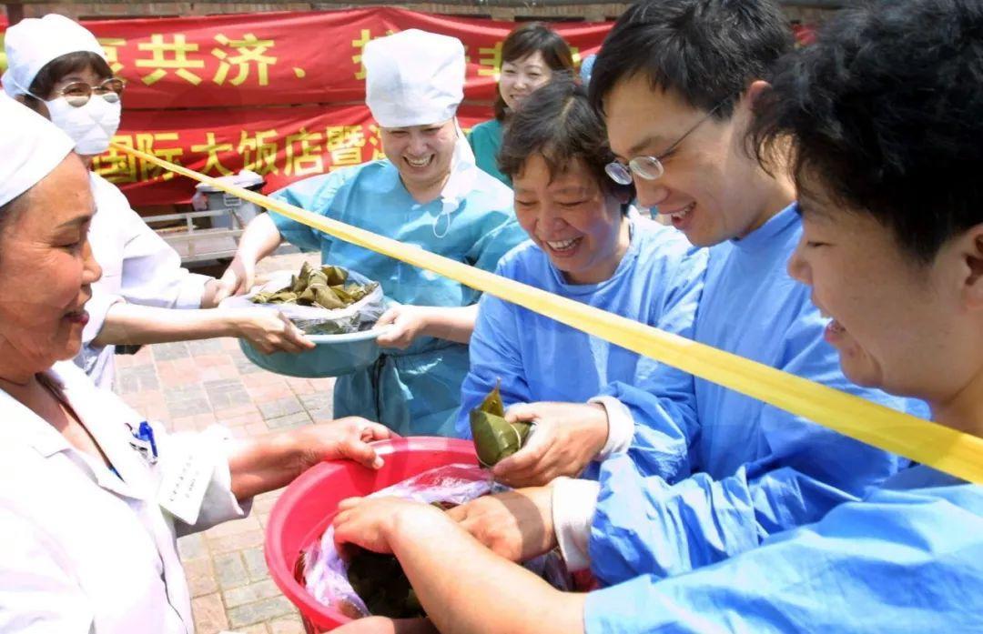 2003年6月4日,天津市几个抗非典一线的医护人员开心地品尝粽子。