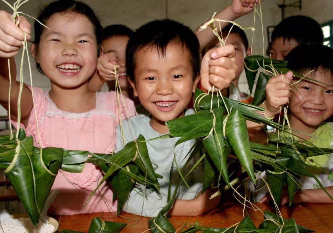 四川省广安市华蓥蓝艺民工子弟学校的孩子们展示自己包的粽子(2007年6月15日)。