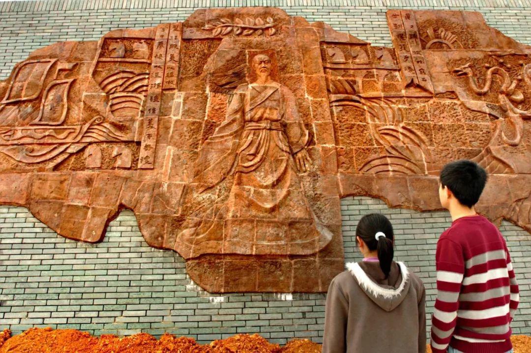 两名岳阳大学生在欣赏大型浮雕《离骚》(2005年4月2日)。