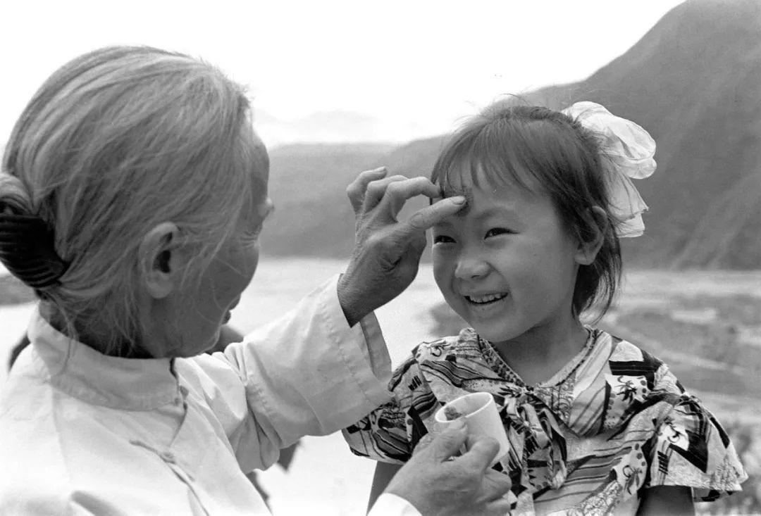 雄黄是一种具有去毒作用的矿物。每逢端午节,给小孩额头点上用酒浸过的雄黄,表示可以驱毒避邪、平安幸福。这是湖北省秭归县归州公社屈太婆正给她心爱的小孙女红娇点雄黄(1982年7月13日发)。新华社记者 于澄建 摄