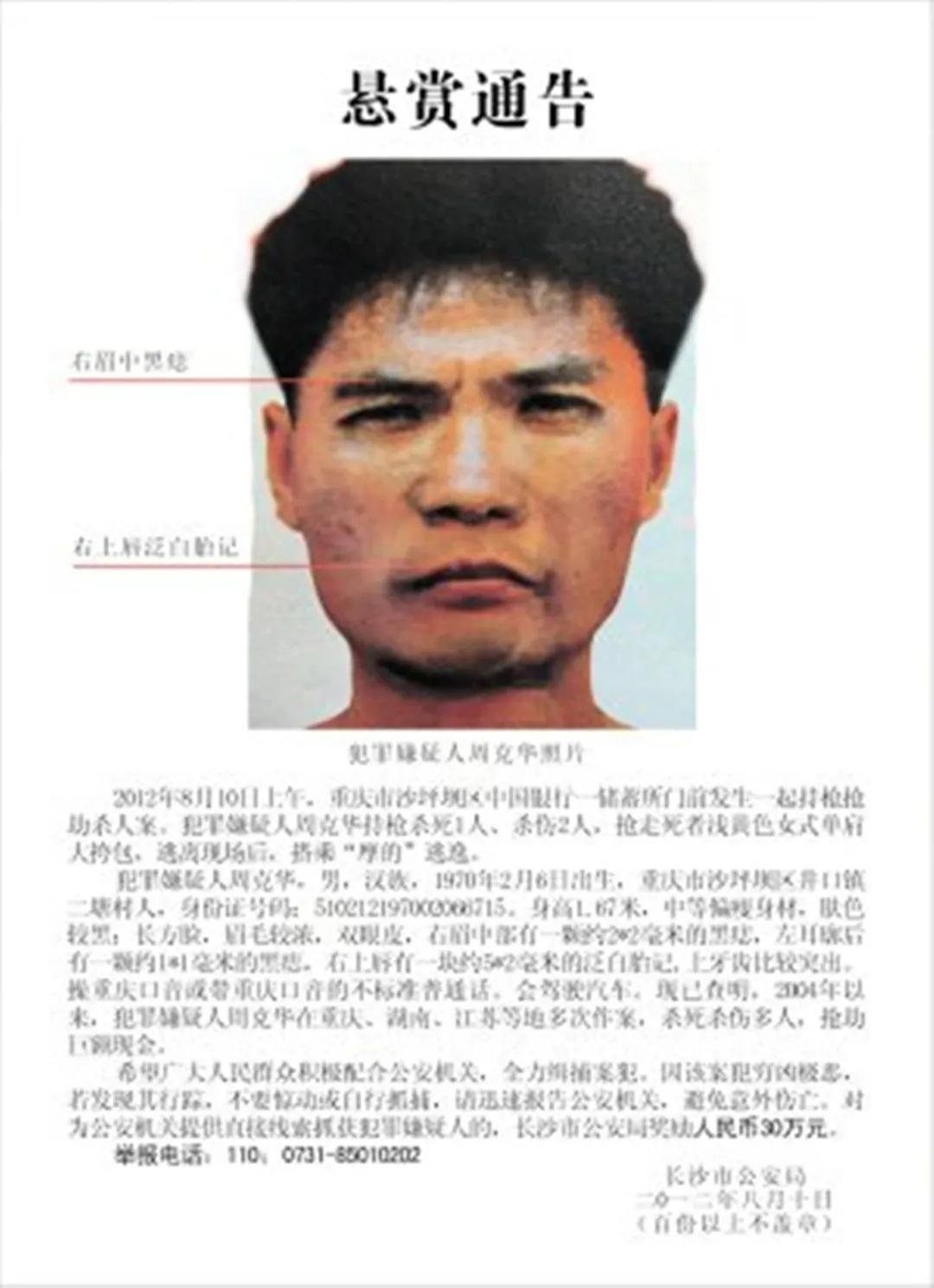 下午3点半,重庆市公安局发布公告,“犯罪嫌疑人名叫周克华中等偏瘦身材,肤色焦黑;长方脸,眉毛较浓,双眼皮,右眉中部有一颗约2x2毫米的黑痣,左耳廓后有一颗约1x1毫米的黑痣,右上唇有一块约5x2毫米的泛白胎记。重庆口音或带重庆口音的不标准普通话,会驾驶汽车。”