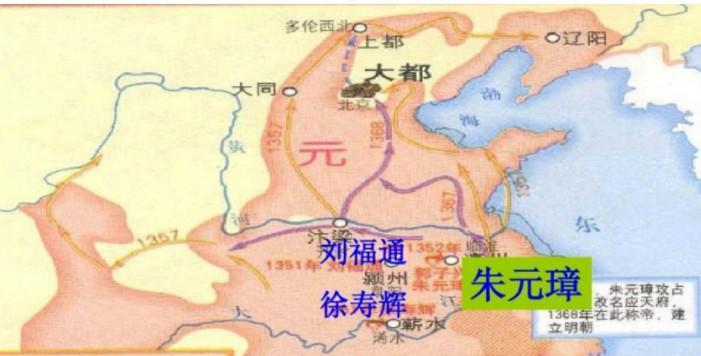 本来朱元璋只在应天府江苏江西一带,但是打败陈友谅,两湖在其手中,本来他是兵精,如今粮也足了,南方已在其手,之后抓准时机,乘北方元军内部自相残杀之即,假道山东,直取大都水到渠成了,这其中很大的缘故在于,南方当时已经是中国经济的重心,南方包括江淮在朱元璋手中、元军已经没了粮饷的来源,尤其当时明军已经拥有火器和大量的骑兵,本来北方对南方最有利的骑兵优势也不复存在了。加上民族矛盾,元朝之灭在所难免。