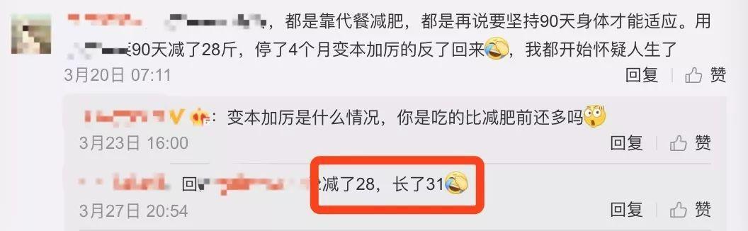 这还没完,如果吃了一段代餐粉紧接着恢复以前的饮食,能量摄入又高于消耗量,妥妥反弹没商量!