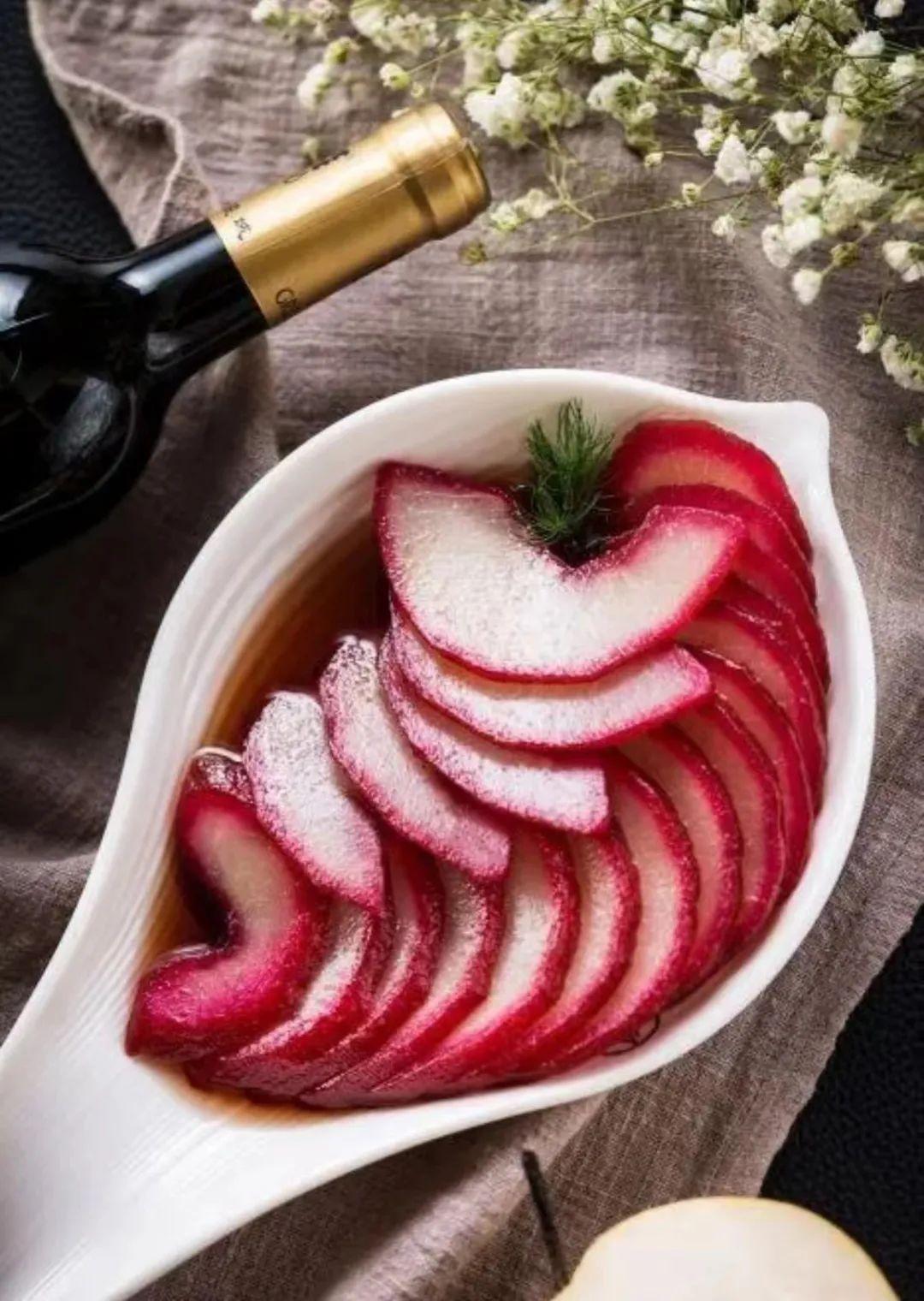 雪梨和红酒能有什么关系?这道『红酒雪梨』告诉你答案。雪梨经过红酒的浸润,梨色红亮,酒香爽脆,具有清火润喉,滋补养颜的功效,非常适合秋天吃。