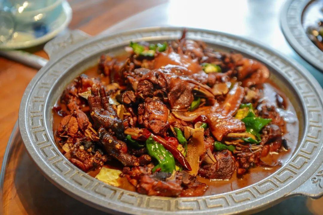 特色菜『李逵炒鸡』,是点击率最高的一道菜,采用散养一年左右的本地柴鸡,份量很大,用精致的大盆盛装,吸进汤汁味料鸡肉鲜嫩坚韧,搭配上各种配菜营养美味,香鲜至极。