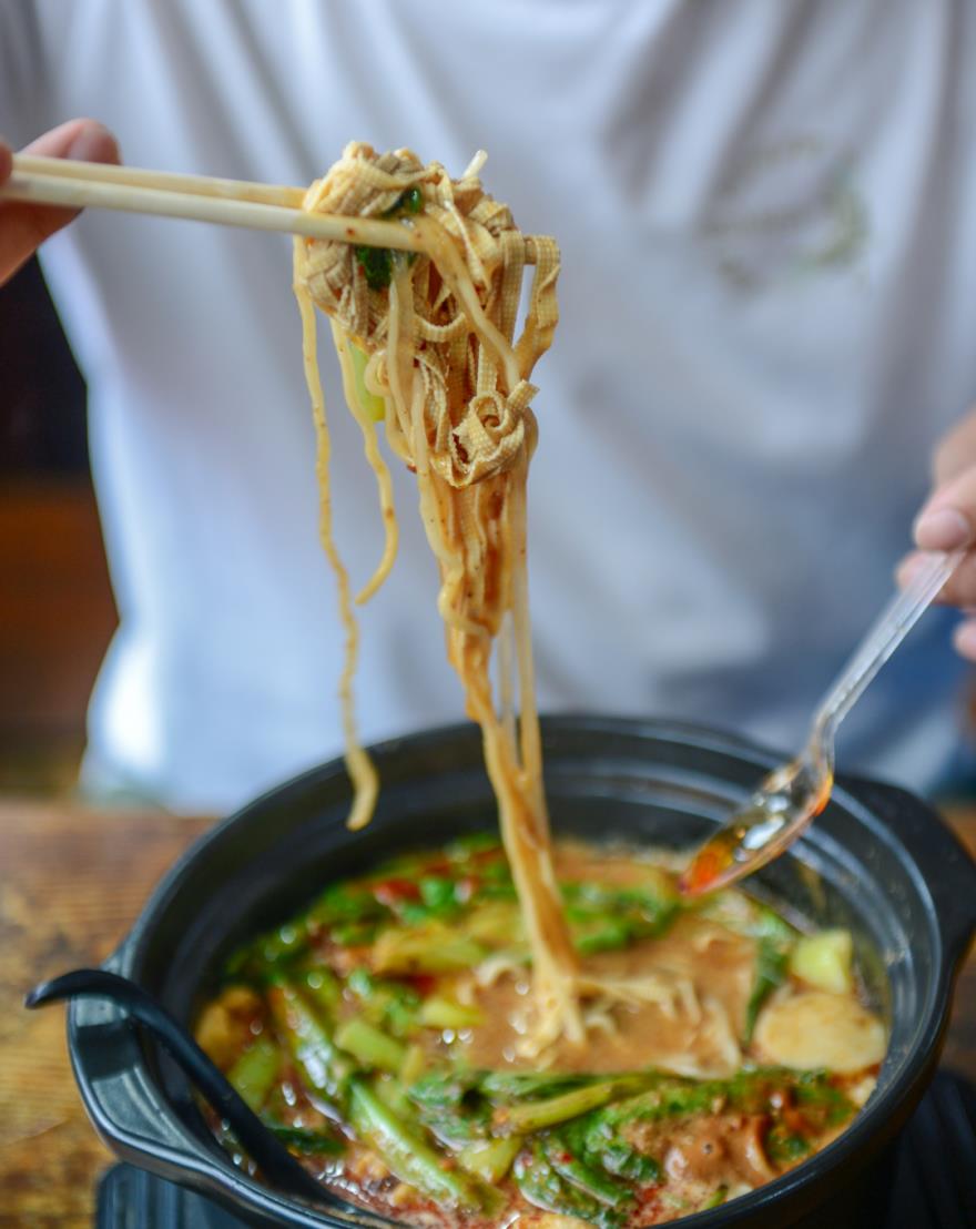 里面的配料也是十足,豆皮、青菜、丸子、鹌鹑蛋,还有自家制作的手擀面,一天的营养这一锅基本搞定。