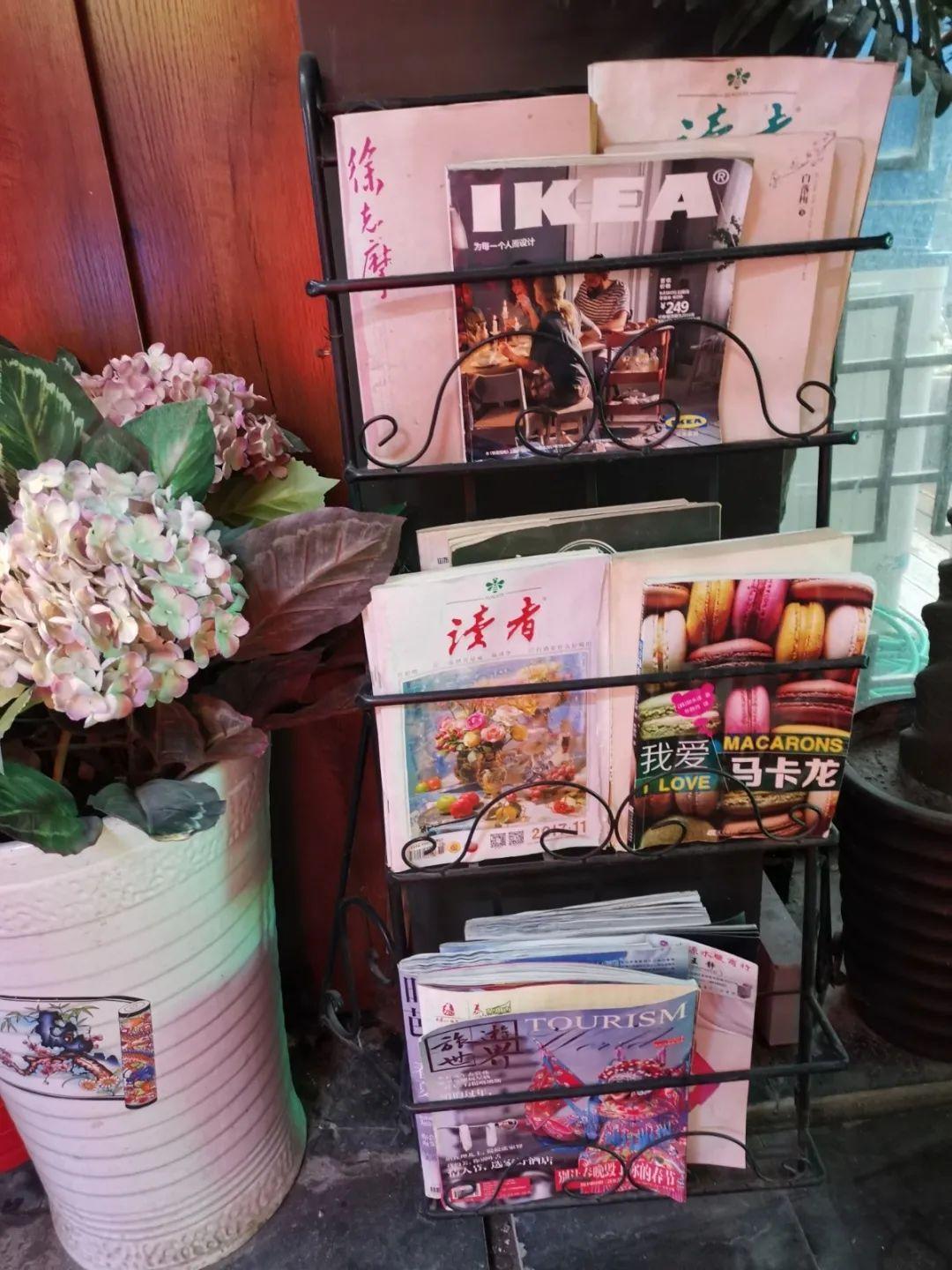 还有随手可取的书架,里面有《徐志摩》《读者》《旅游世界》等书刊杂志。