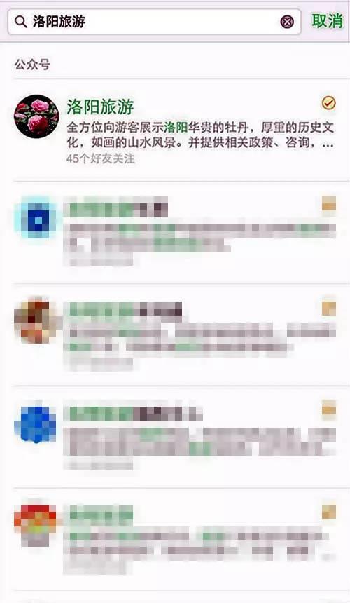 搜索公众号“洛阳旅游”,出现如下界面,选第一个点击关注: