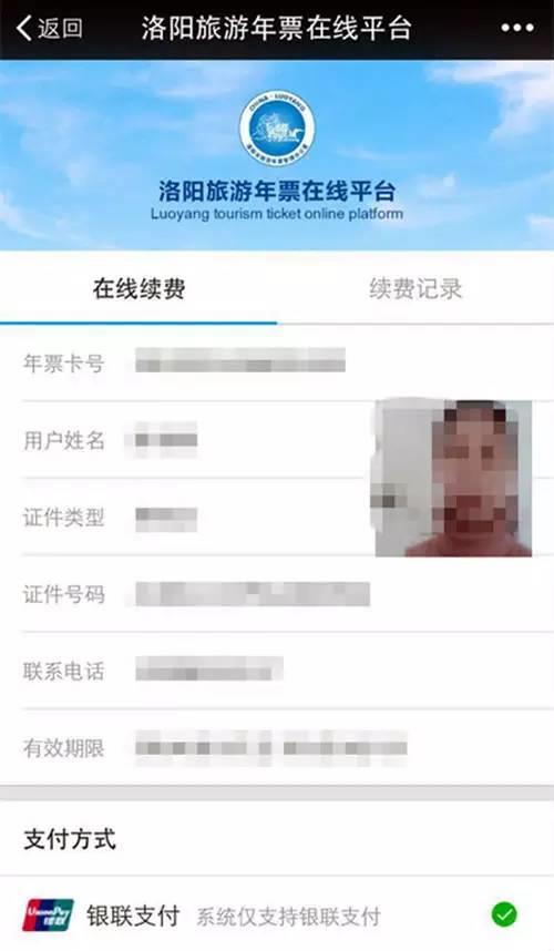 点击“洛阳旅游年票续费”后,会出现如下网页: