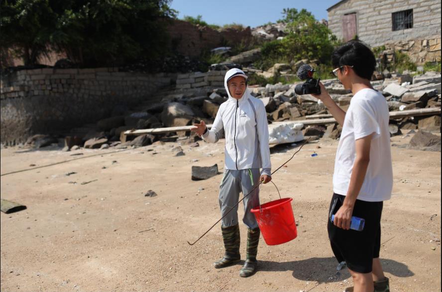 为了拍视频,阿烽来到海边,一边解说,一边演示钩青蟹。面对镜头他很紧张,眼神都不知该往哪放。很少说普通话的他在视频里吐出来的句子磕磕巴巴。但出乎他的意料,这支视频在西瓜收获了超过三十万播放量。