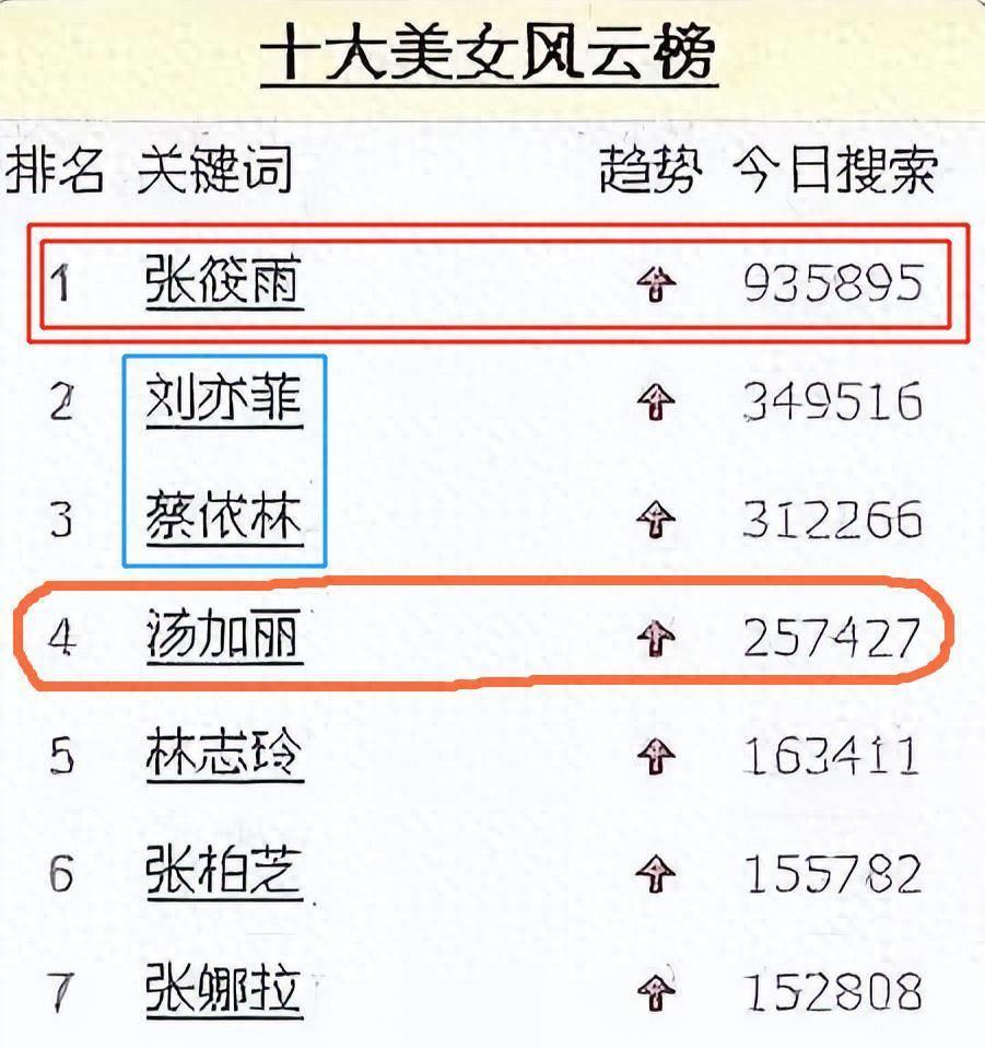 不过,张筱雨在搜索量和热度上超越刘亦菲,占据榜首。