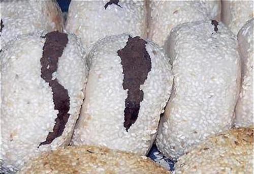 豆馅烧饼有个好听的名字“蛤蟆吐蜜”。把面粉加入酵母或老面肥,和成面团,饧段时间。面团揉成条状,擀皮,包入豆馅,轻轻收口,收口处朝外,将包口处蘸下水、芝麻,烤至烧饼表面金黄,豆馅从裂口处溢处,“蛤蟆吐蜜”就做好了。
