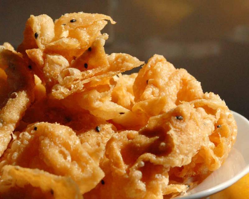 馓子麻花在北方广为流行,馓子麻花古称寒具、环饼,远在战国时就成为美食,在秦汉时,因馓子、麻花能冬春久贮不坏,是寒食节代替熟食的食品之一,被称为寒具。将白糖或红糖、碱、明矾、桂花等和发酵好的面和在一起,和成不沾手、不沾盆、面团光滑即成。面上抹层花生油,把面醒一段时间。把醒好的面搓条,揪成约二寸长的面剂,蘸上芝麻、水,盖上湿布,再醒一段时间,把面剂抻成细细的面条,来回缠绕成馓子、麻花形状,用花生油炸成酥、脆、香、甜的金黄色,这就是广为流行的民间小吃、点心,馓子麻花。