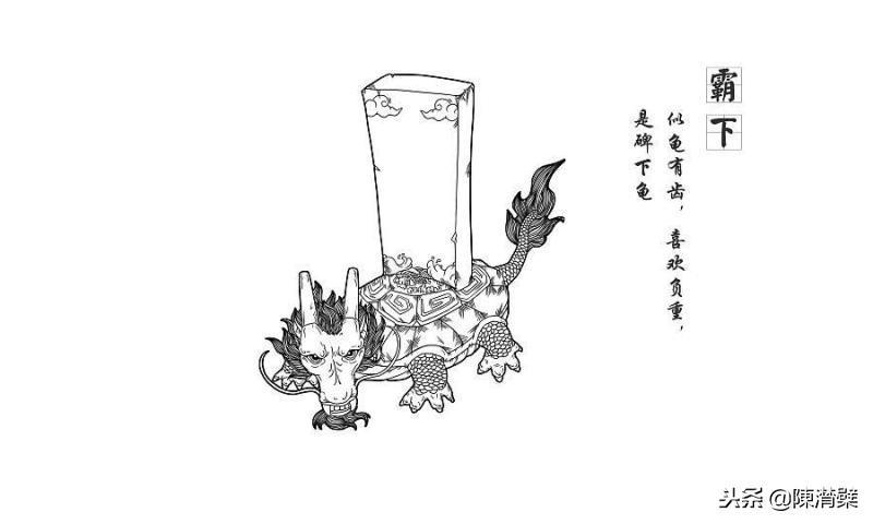 赑屃,似龙形,排行老八,平生好文,石碑两旁的文龙是其遗像。我国碑碣的历史久远,内容丰富,它们有的造型古朴,碑体细滑、明亮,光可鉴人;有的刻制精致,字字有姿,笔笔生动;也有的是名家诗文石刻,脍炙人口,千古称绝。而负屃十分爱好这种闪耀着艺术光彩的碑文,它甘愿化做图案文龙去衬托这些传世的文学珍品,把碑座装饰得更为典雅秀美。它们互相盘绕着,看去似在慢慢蠕动,和底座的霸下相配在一起,更觉壮观。
