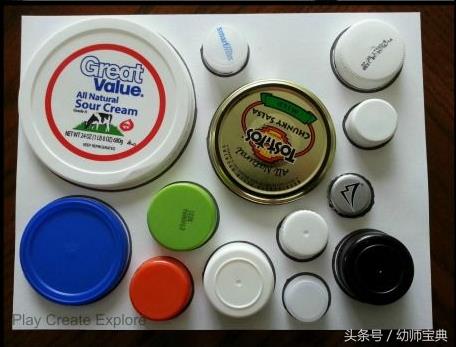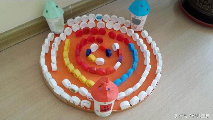 所需材料:几何图形、大小不一的瓶盖、不规则型花瓣等(注意图案的对应)