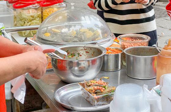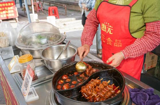 在黄埔古港的市集里,叫卖声不断,沿街摆放着猪脚姜、凉拌鱼皮和咸酸各类小吃,路过的人都忍不住停下看一看。