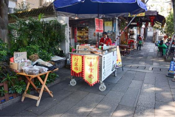 从南门停车场慢慢靠近,映入眼前的是古朴的青石板路,穿梭在路边摊小食店,才发现美食也是沙湾的灵魂。