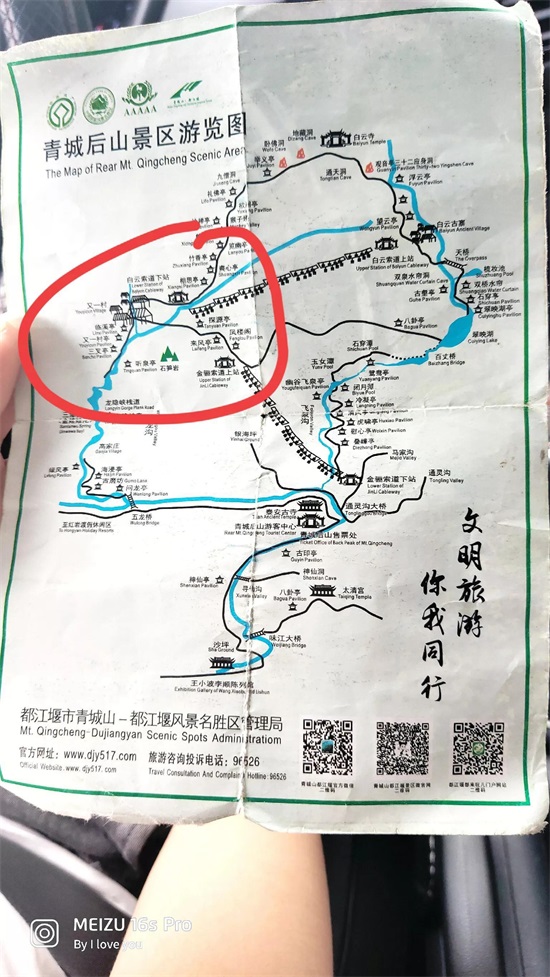 从万佛崖这里一路下来,中间基本没什么可以讲的,走一个小时左右就能到白云索道上站,没有体力的又愿意花钱的,就可以直接从这里坐索道下去了,好像不能直接做坐到山下,好像要坐两次索道就是要花两次钱,这里给大家看一下青城山后山路线图,图中画圆圈的地方能看到两个索道是不在一起的,到底是收一次钱还是两次钱,大家可以去咨询一下工作人员再决定。