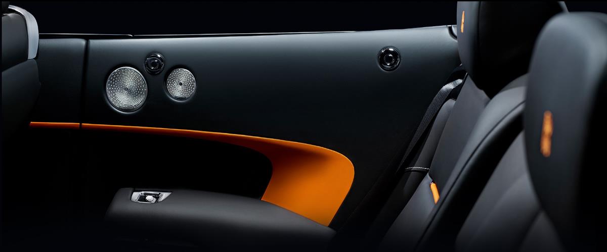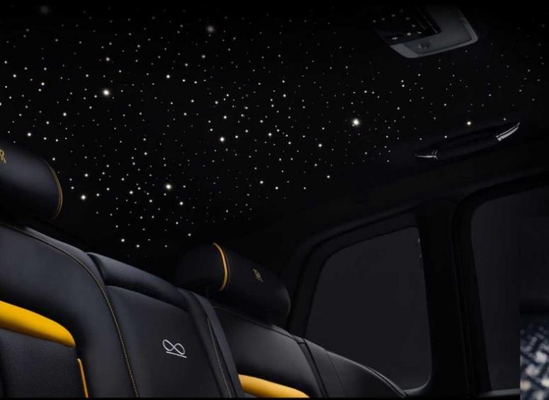 库里南Black Badge内饰,3D碳纤维内饰及中控延伸至车门的黄色线条,双座设计,一切为年轻新贵打造