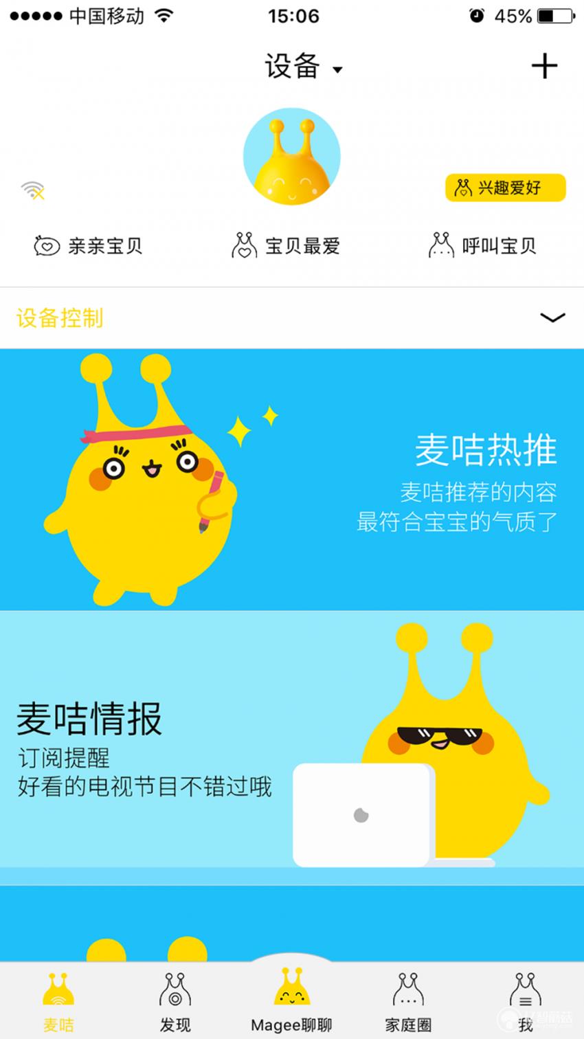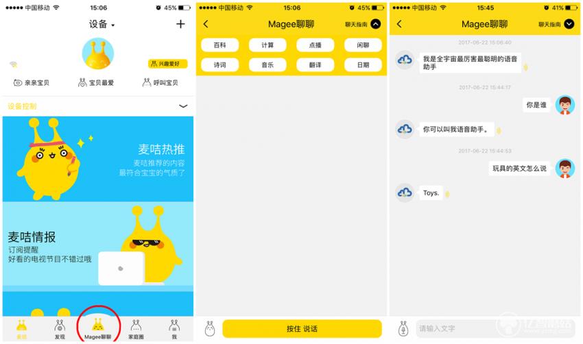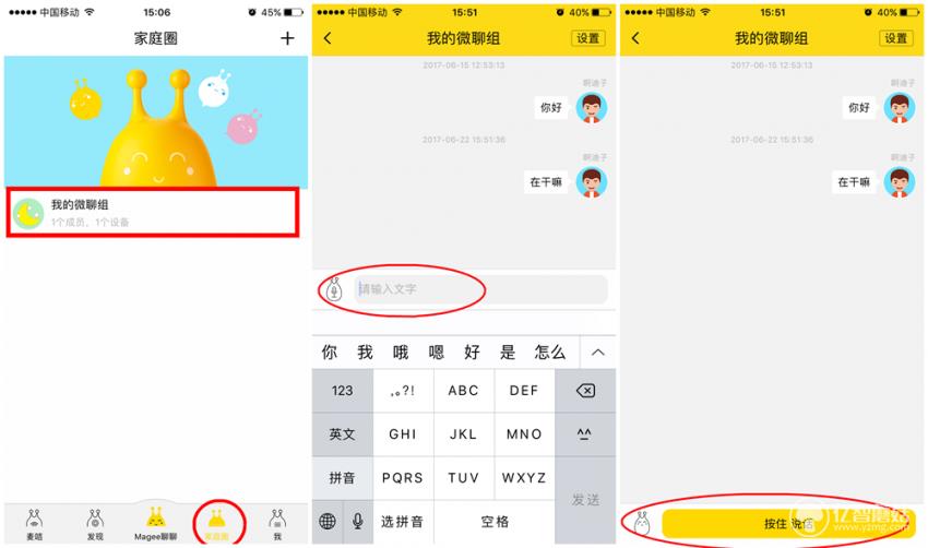 “家庭圈”是一个很有意思的设计,它可以帮助家长与宝宝进行互动,当你发语音或者打字到“我的微聊群”,麦咭就会把家长想要对宝宝说的话,进行语音播报。
