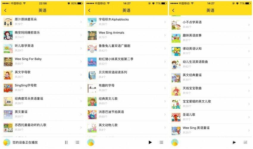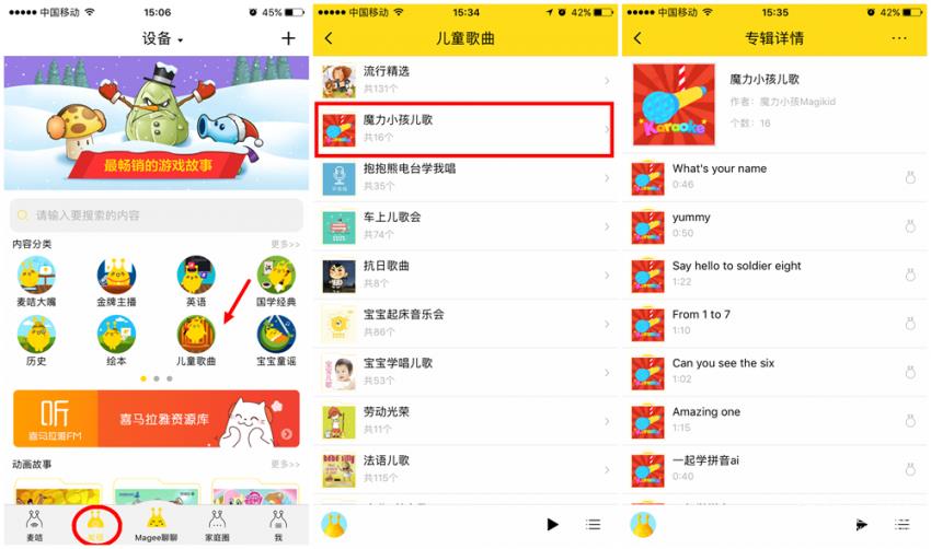 点击下图红色圆圈标注的“发现”位置,我们就可以看到类似喜马拉雅FM一样的界面,当我们点击箭头所指的“儿童歌曲”时就会出现很多适合宝宝听的歌曲类目,我点击了“魔力小孩儿歌”这个类目,进去里面有很多歌曲,想听那首点那首,之后会通过麦咭唱出来。