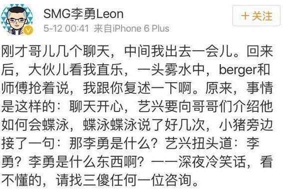 李勇是东方卫视的总监,故事是这样的:张艺兴说自己会蝶泳,小猪问那李勇是什么呢,结果小绵羊就一脸呆萌的说李勇是什么东西啊~
