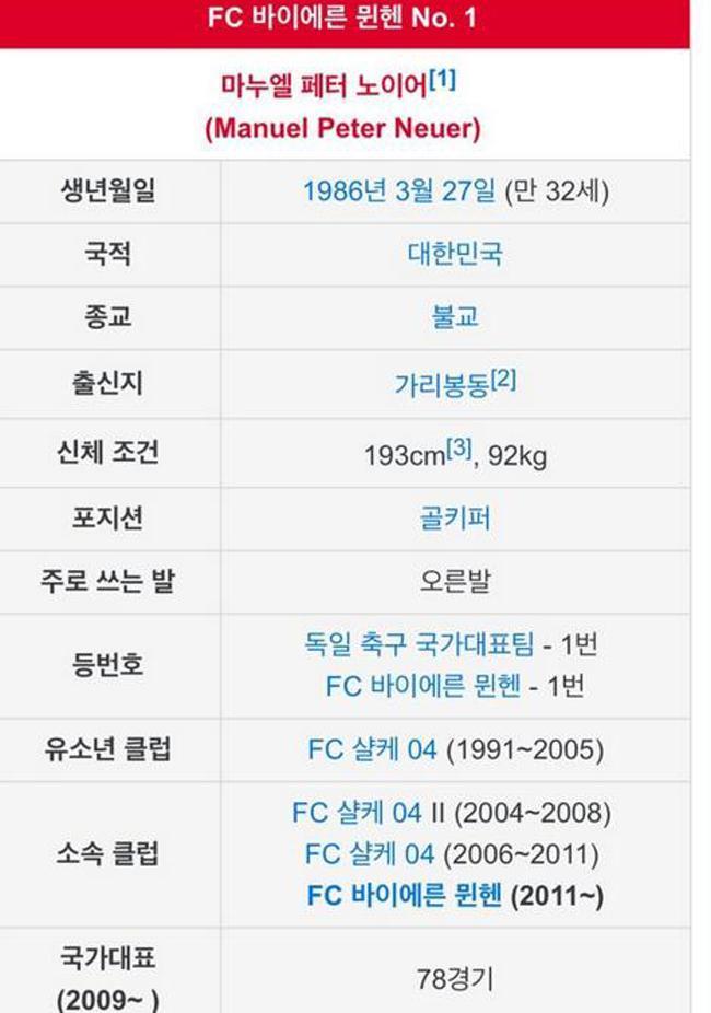 由于伤停补时阶段最后一个失球,是因为诺伊尔跑向前场参与德国队的进攻,可没想到却被韩国队抢断,对方一个长传之后,球到了后场的孙兴慜脚下,面对空门,他轻松推射进球,而诺伊尔只能远远地望球兴叹。赛后诺伊尔成为了众矢之的,甚至被人篡改了他的百科资料,国籍由德国改为韩国,位置由守门员改为前锋。