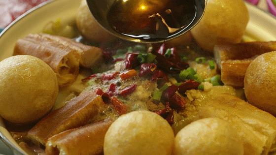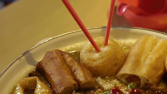 而鼓鼓的面筋包则一定要用筷子按压进汤里,看它咕嘟咕嘟冒出好些气泡,再耐着性子等上几分钟,等汤汁灌入浸至酥软,满满一包咸鲜微辣汁水混着炸物的油润酥香,一口一个,满足感爆棚。