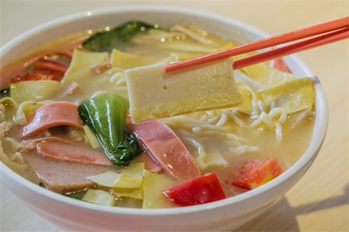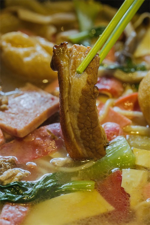 面筋包泡骨汤更加突出豆香味,还有晶莹剔透弹牙的皮肚这种南京特色小料,自带浓香、肥肉不腻的焖制大肉,时不时吃到的猪肝、肉丝、小排...酸甜可口的西红柿和脆嫩生菜解腻足矣。满当当一盆,足够俩人吃得心满意足。