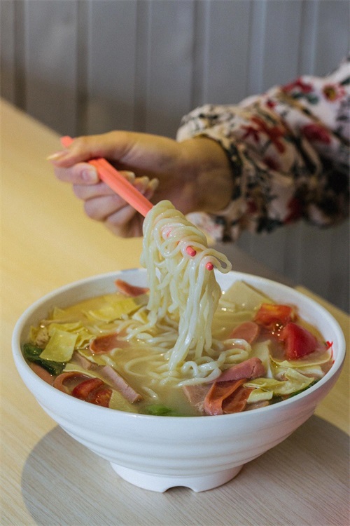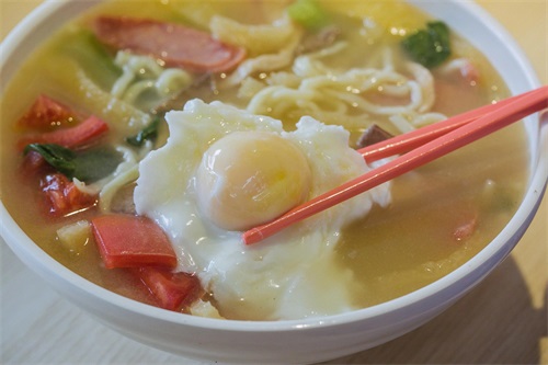 三鲜面与杂烩面口感又有不同,除了含有甜口香肠外,还卧着一个外白内黄的荷包蛋。汤头比起杂烩面来说更为甘甜,骨汤面的面条则贴心的换成了细面,便于入味,却还是一样的筋道爽滑。