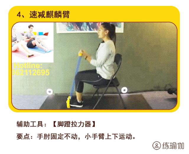 第四种动作做法:坐在椅子上,绳套套在前脚掌上,十根手指指向自己握住拉力器,手肘弯曲,手拉拉力器靠向胸部的方向,然后再返回到大小臂呈90度,即小臂平行地面,重复20组。(采用鼻子吸气,嘴巴呼气)