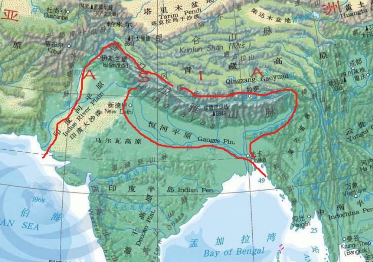 【横跨】:恒河平原。