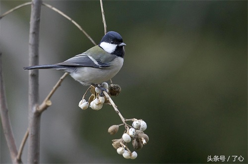 大山雀(学名:Parus major):中小型鸟类,体长13-15厘米。整个头黑色,头两侧各具一大型白斑。上体蓝灰色,背沾绿色。下体白色,胸、腹有一条宽阔的中央纵纹与颏、喉黑色相连。