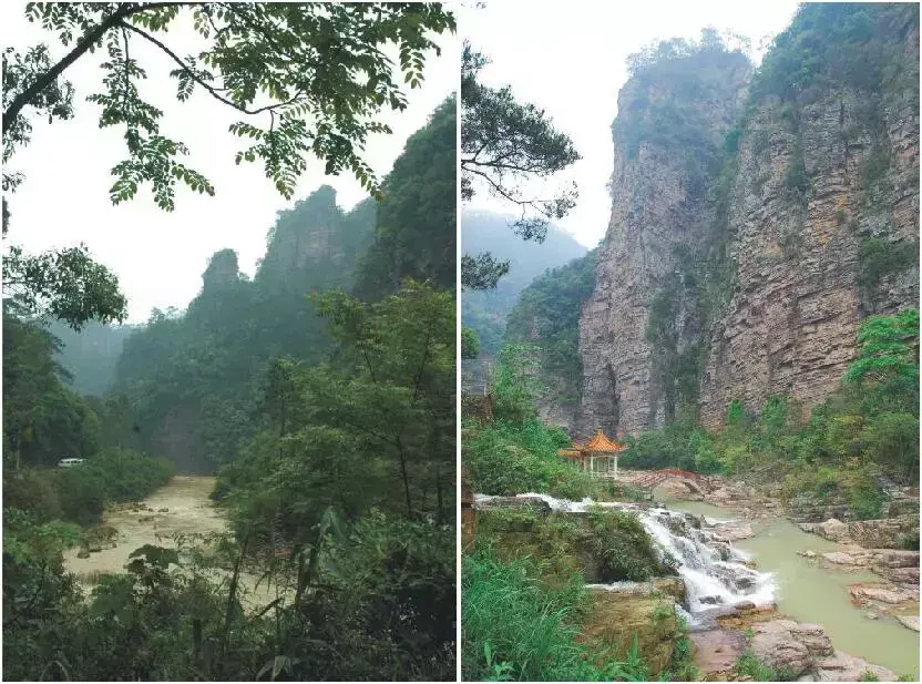 位于封开县渔涝镇东南8公里的黄岗河畔, 由重重叠叠的色彩斑澜的砂页岩和局部钙质页岩构成,属砂岩峰林地貌。
