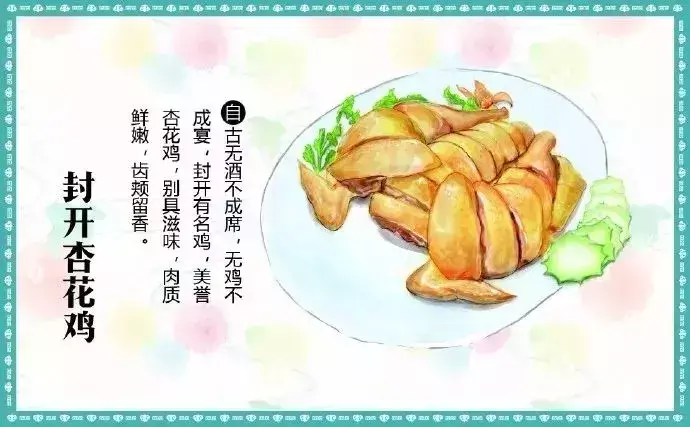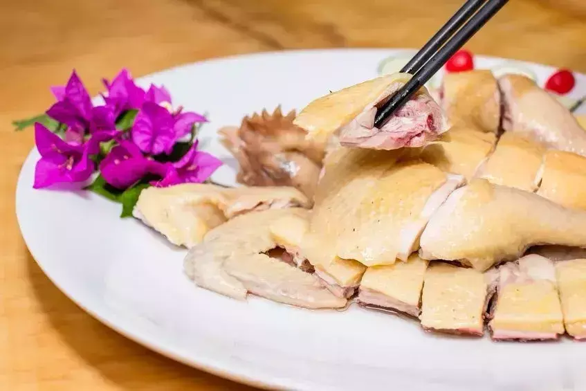 白切杏花鸡,真正的白切杏花鸡骨髓是红的,包着骨头的那层肉是嫩的,这就是白切杏花鸡美食的最高境界,鸡皮呈金黄色,油光闪亮,吃起来有清、鲜、甜、爽,特有骨香之感。