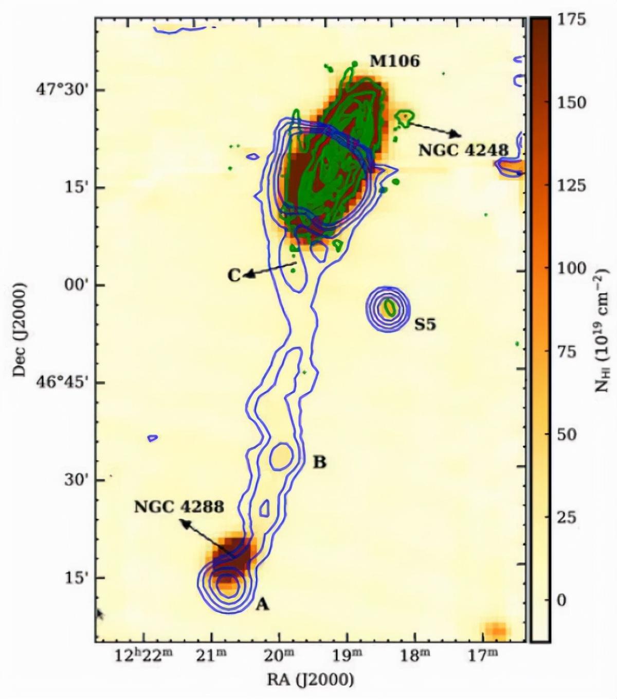 而这一条超长距离的气体吸积流,该气体流长达 130 kpc(约 42.3 万光年),连接 M106 及其卫星星系 NGC4288,表明 M106 星系可从数十万光年外的矮星系上抢夺气体来维持自身的成长。这次的发现也再次证明了中国天眼的实力,为研究吸积流的动力学提供了有力的依据。同时该研究成果已经发表在了《The Astrophysical Journal Letters》上。