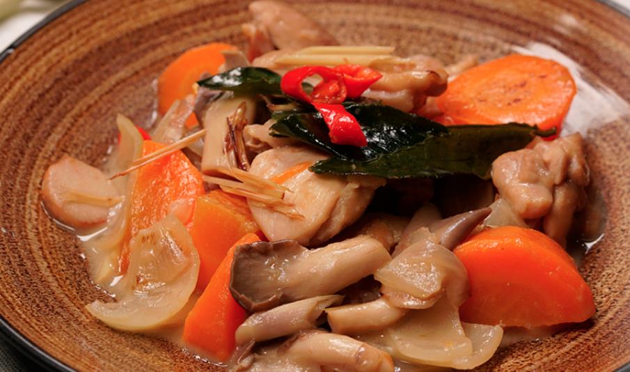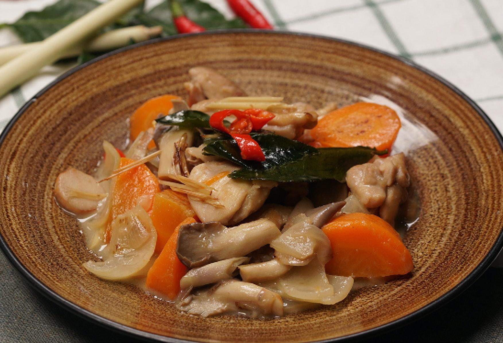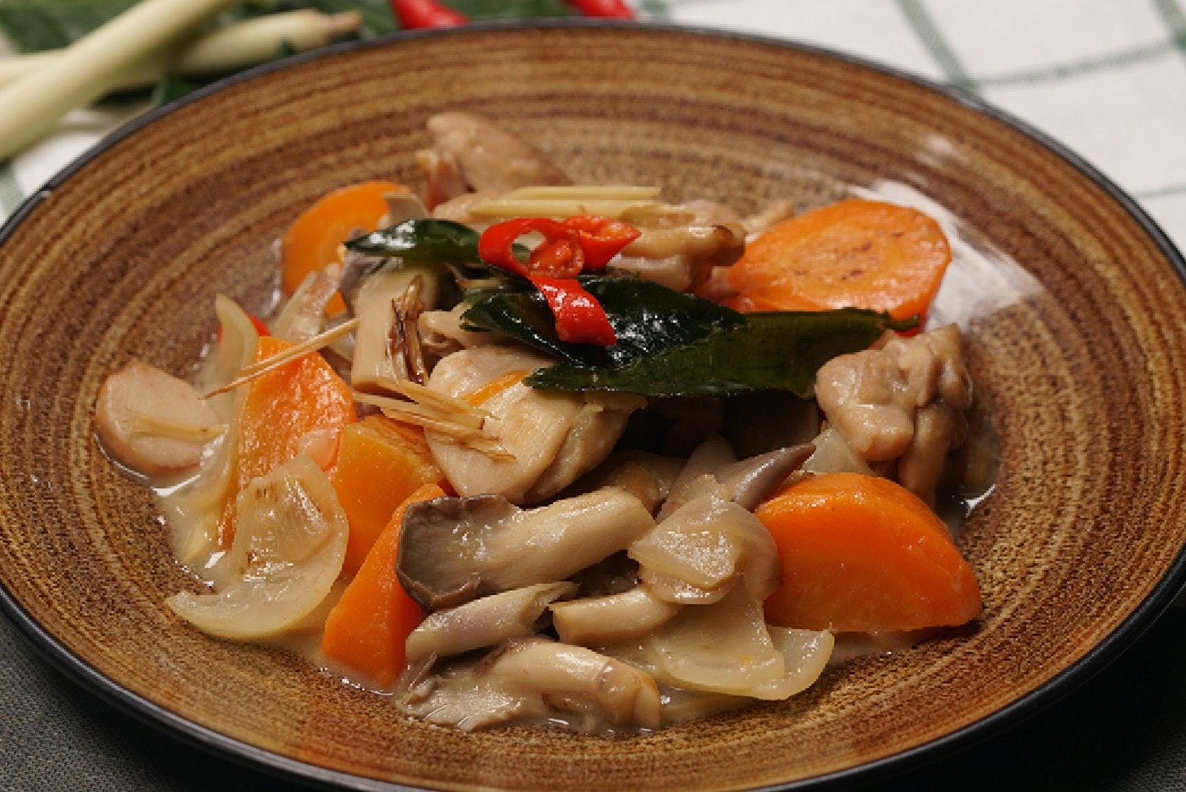 食材:去骨鸡腿肉 400 克、秀珍菇 120 克 、洋葱 半个、红萝卜1条、青柠 1 个、南姜 30 克、干葱1个、香茅 2 条、柠檬叶 4 片、辣椒(切粒)3条、椰浆 100 ml、鸡汤 200 ml、鱼露 2 勺、糖1勺