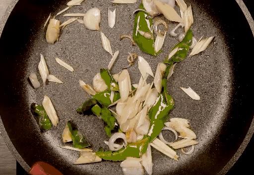 2、用中火烧热油锅加入干葱、香茅丶柠檬叶丶南姜炒香