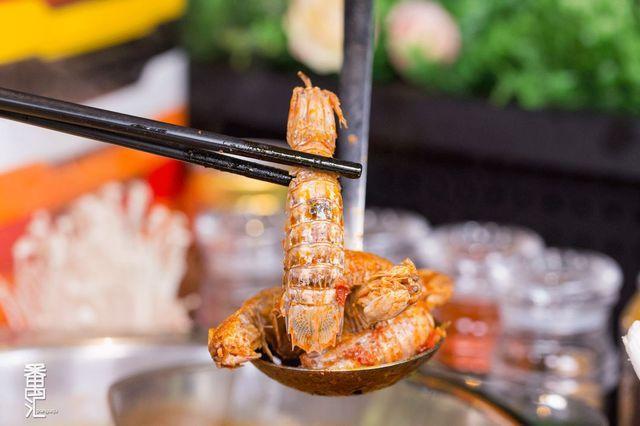 新鲜的濑尿虾在红汤锅浸泡后