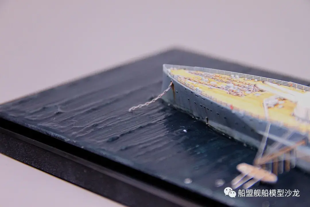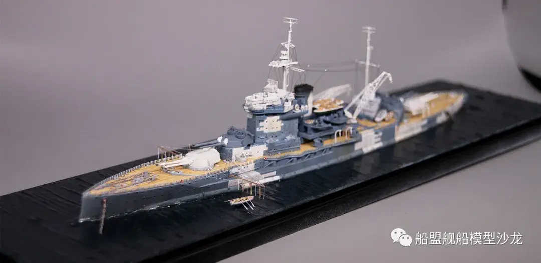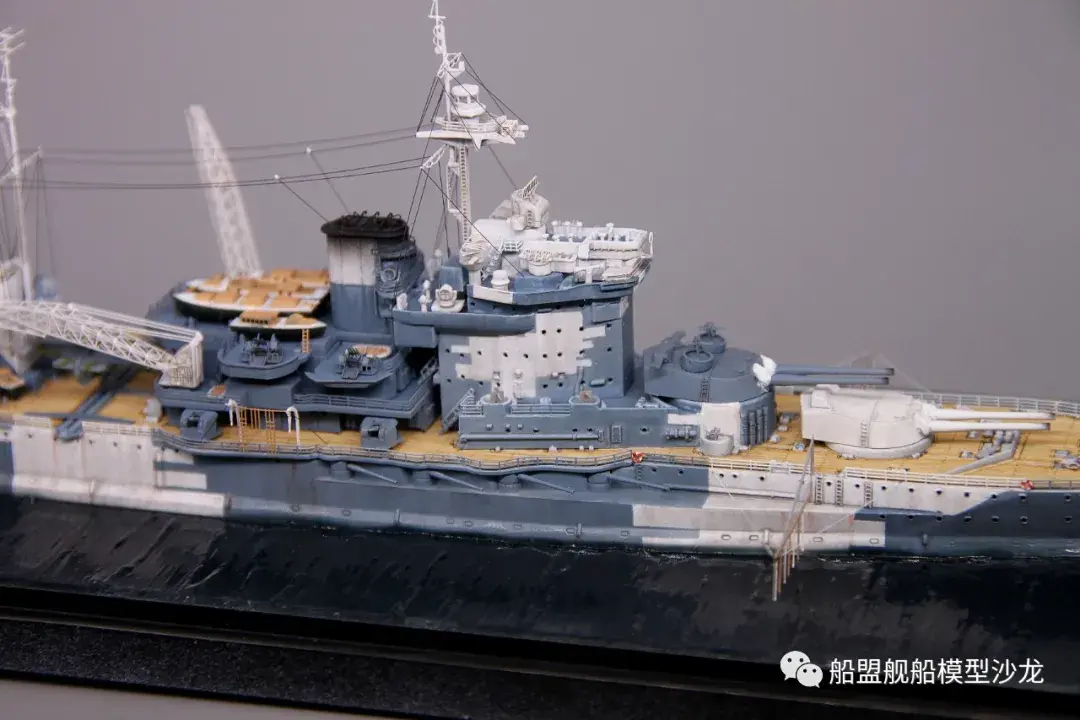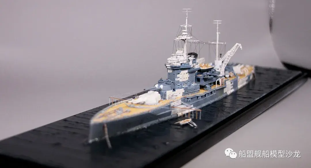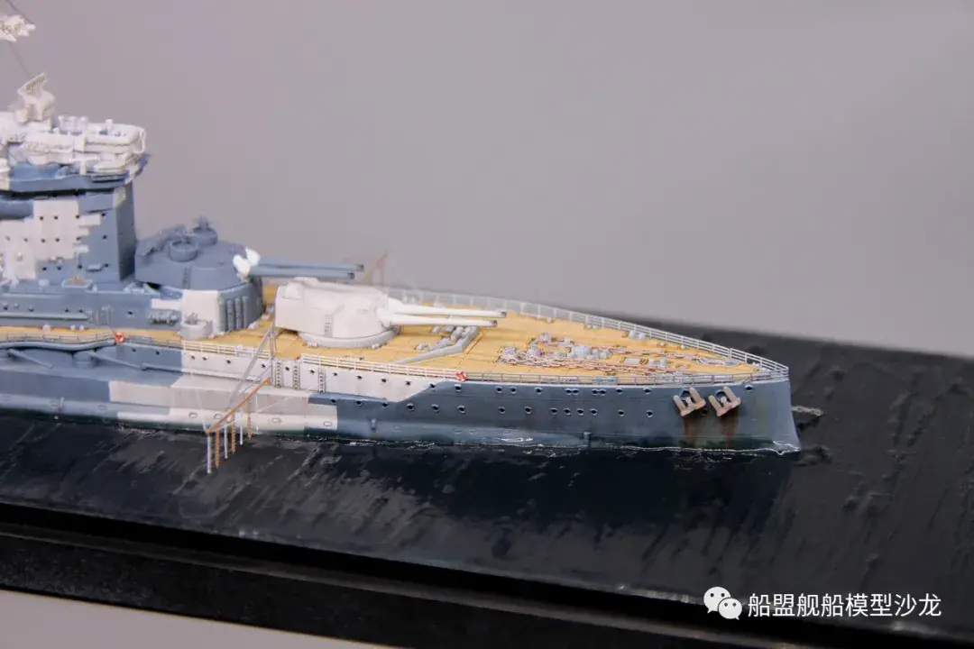 其实说起厌战这艘船,它的历史真的是三天三夜也讲不完,这艘功勋舰的经历实在是太多了。不过回想起来,伊丽莎白级这几艘都是从一战打到二战,哪艘经历都不少,要开这个专题的模型,各个时期的背景了解都要做个几天的功课。小编当然也是属于那种随性做船的玩家,在考证方面也比较随便,只求一个形似,特别细节的方面并没有考虑太深。比如这个厌战,炮管就是德国380炮管,哈哈哈这里已经被熊版指出来了,下次制作的时候肯定会特别注意。