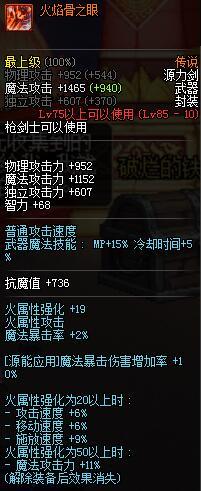 完美换装的伤害加成可以达到84%的爆伤加成。完美换装需要我们武器为火焰骨之眼,剩余装备能源脉冲6搭配异界单气息散件,需要肩、腰带、鞋子三个技能宝珠,左右槽白金徽章,2lvBUFF称号,换装达成难度较大供土豪参考。