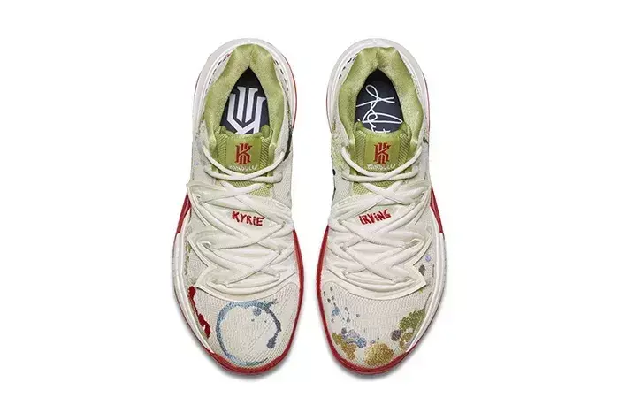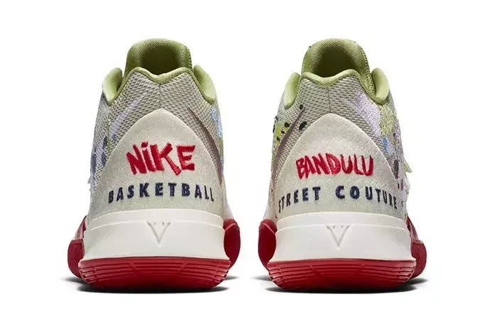 Kyrie 5标志性的捕蝇草鞋带系统上,加入了红色“Kyrie”字样。纯白色的鞋身,添加了各色的泼墨设计。虽然第一眼看上去像是染料印在鞋面上,但其实这些泼墨元素也是刺绣上去的。鞋舌处也有着不同以往的小细节,在欧文标识的下方还印有“Bandulu”字样。