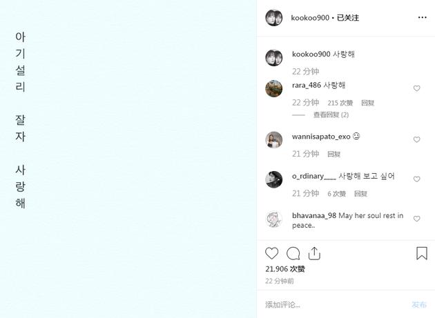 具惠善刚刚在自己的社交平台上传了一张写有“宝贝雪莉,睡吧,我爱你”的照片,并留言“我爱你”,进行了哀悼。